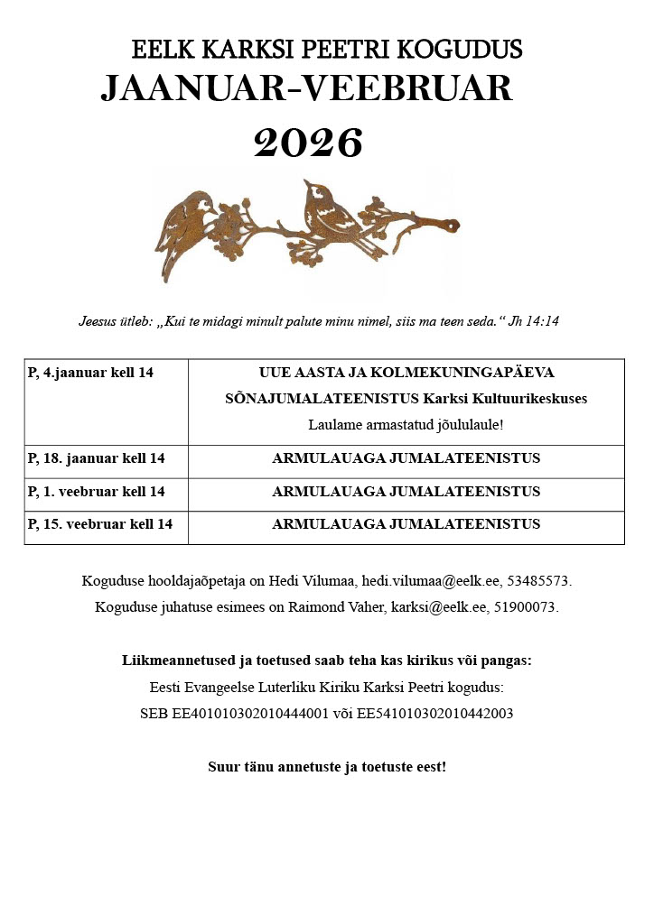 P, 16. november kell 14 ARMULAUAGA JUMALATEENISTUS. Kohvilaud