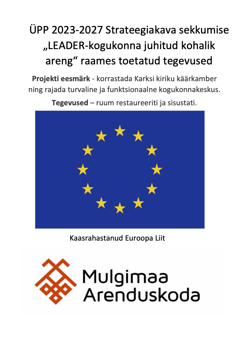Sel sügisel saab Karksi kiriku käärkamber uue kuue – omakandi rahvast ja kaugemalt tulijaid ootab peagi turvaline, korras ja kaunis ruum. Korrastatav käärkamber on osa Karksi kiriku väärtuslikust ajaloo- ja kultuuripärandist ning on seega üks Karksi ja kogu piirkonna visiitkaarte.Kogu ettevõtmine maksab ca 31 670 eurot ja saab teoks PRIA Leaderi toetusega. Koguduse kanda jääb…
